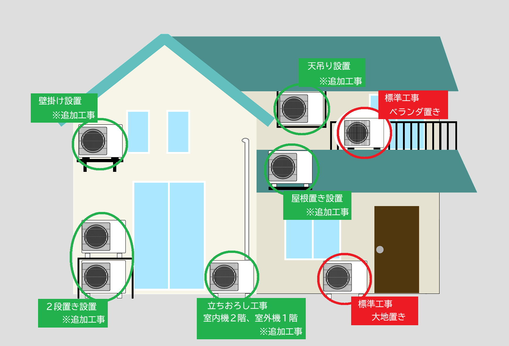 | ④室外機設置 | 室内機と同じ階に設置し、地面置きやベランダ置き |